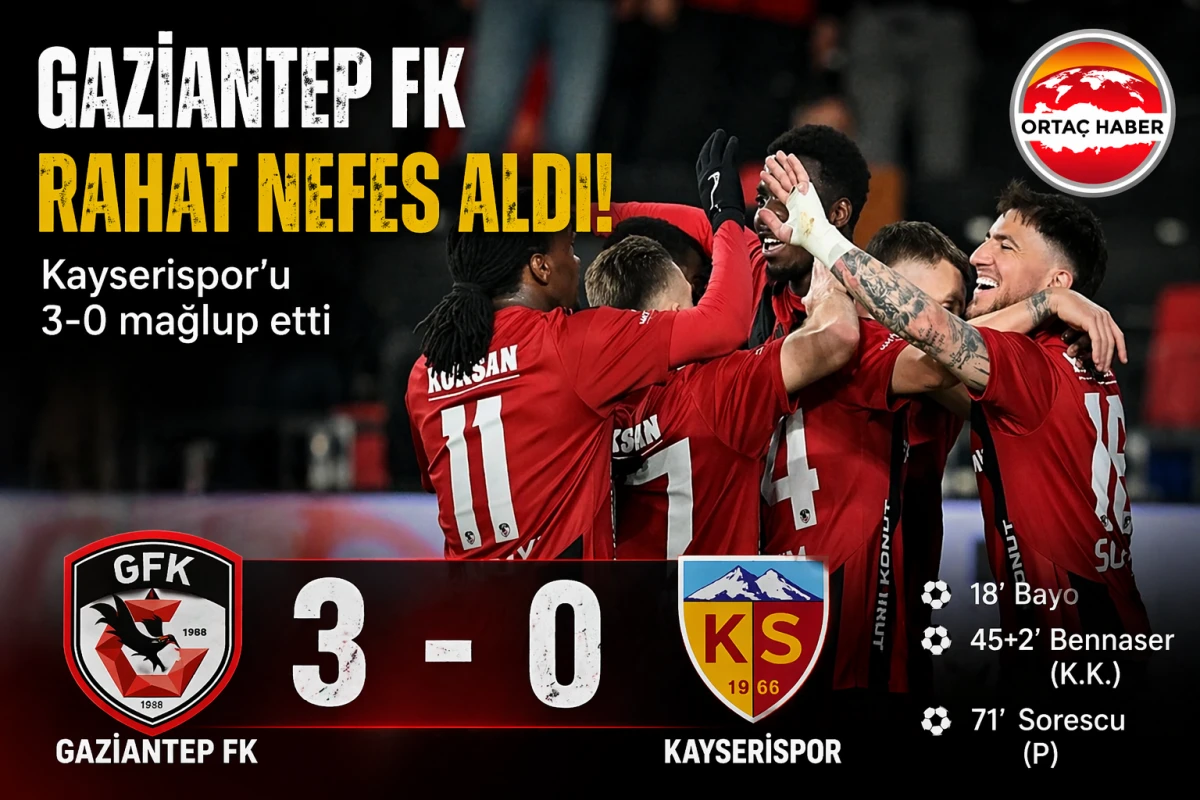Gaziantep FK, Kayserispor’u 3-0 mağlup ederek 3 maç sonra kazandı. Süper Lig’de puanını 37’ye yükselten Gaziantep, düşme hattından uzaklaştı.
