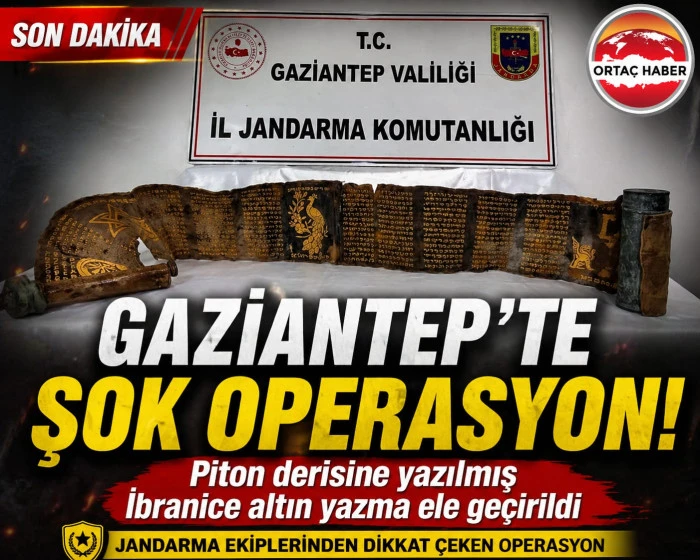 Gaziantep’te güvenlik güçleri tarafından gerçekleştirilen operasyon kapsamında, tarihi ve kültürel değeri olduğu değerlendirilen dikkat çekici bir eser ele geçirildi. İl Jandarma Komutanlığı ekiplerinin yürüttüğü çalışmalar sonucu, yaklaşık 2 metre uzunluğunda piton derisi üzerine işlenmiş İbranice altın yazma bulundu.