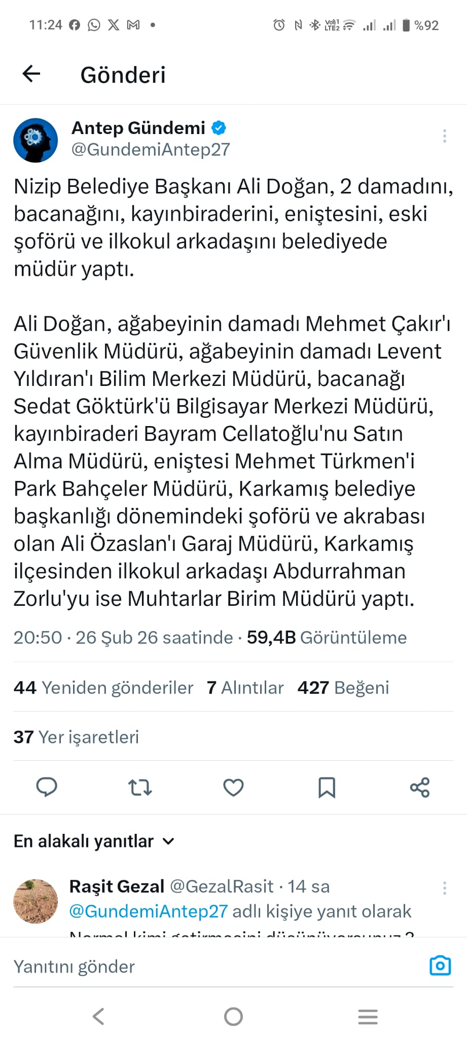 Gaziantep’in Nizip ilçesinde Belediye Başkanı Ali Doğan hakkında ortaya atılan “akraba ataması” iddiaları kamuoyunda tartışma başlattı. Sosyal medyada paylaşılan bir gönderide, Başkan Doğan’ın belediyede bazı müdürlük görevlerine yakın akrabalarını ve tanıdıklarını getirdiği öne sürüldü.